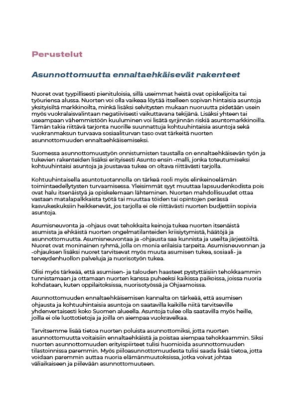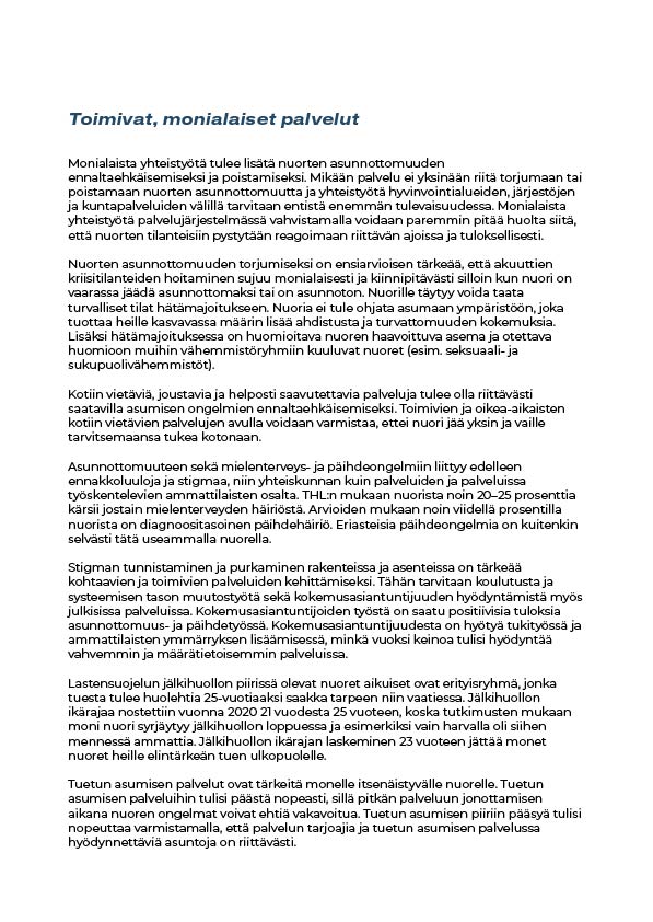 4. Asunnottomuutta ennaltaehkäiseviä palveluja, kohtuuhintaista asumista ja sosiaali- ja terveyspalveluja tulee olla saatavilla tasavertaisesti kaikkialla Suomessa. Nuorten tarpeet ja kokonaisvaltainen hyvinvointi on pystyttävä tunnistamaan palveluissa paremmin.